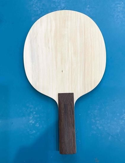 使用しておりますCNFシートは王子ホールディング社製です。ラケットの開発の意図は攻撃をした時に弾きが良く、しなりが少ないスマッシュを多く打つカットマン用を考えました。グリップは重量のあるウエンジ材をを使用することで手元に重心を移し安定感を出しています。ただ重量が101gと重くなってしまったために使用される選手が限定されてしまいます